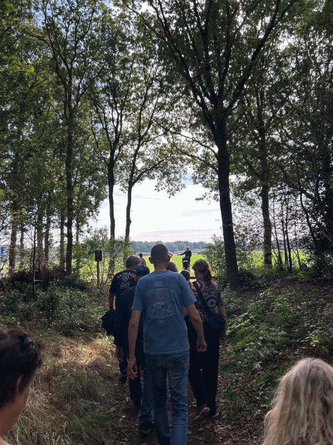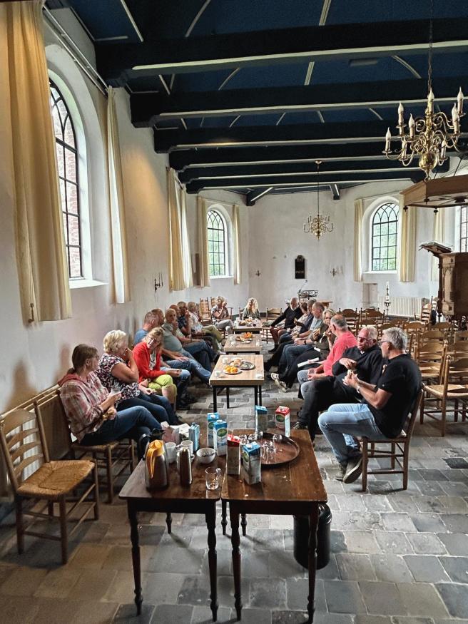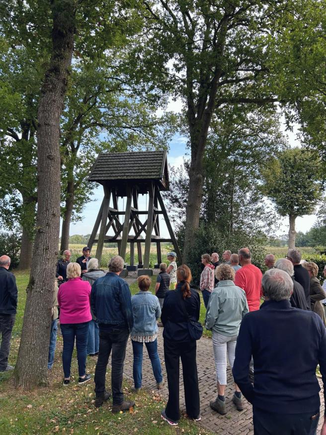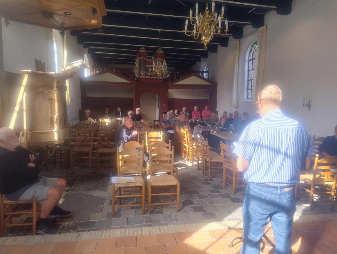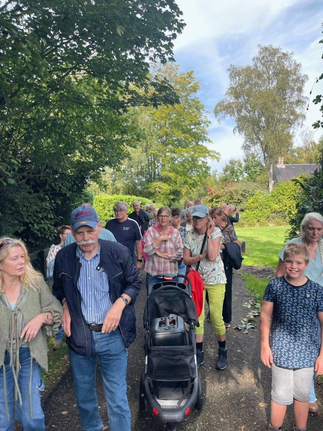 Sijtie Huisman: 'De georganiseerde wandeltocht op 20 september was een succes! Hendrik de Vries, met zijn rustige stem, kon mooi vertellen in ’t Frysk’. Aangevuld door Jan Mulder, kregen we te horen wat er historisch had plaatsgevonden op bepaalde locaties aan de Kerkelaan, Weversbuurt, Aaltjelaan en terug naar het kerkje. De historie van het kerkje werd ook verteld, erg interessant. Als ‘mienskip’ werden er contacten opgedaan en de werkgroep ‘fiets- en wandeltocht’ zorgde voor koffie en broodjes. Een erg geslaagde eerste tocht van de werkgroep!